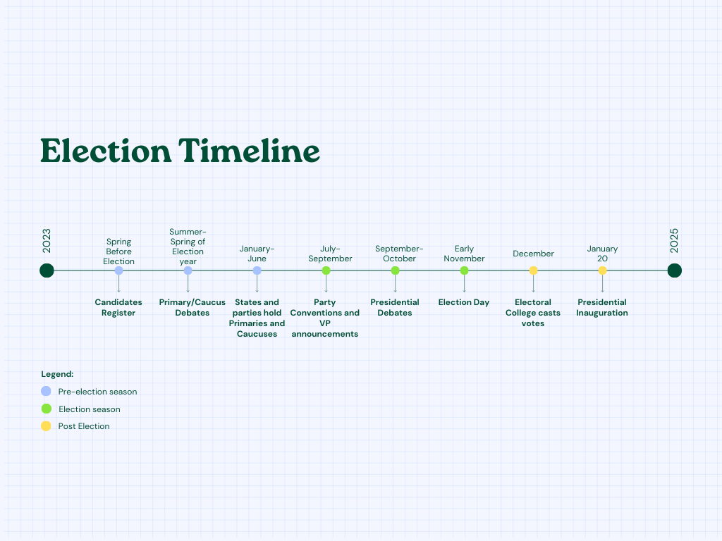 The election process is much more than going to the polls on the first Tuesday in November and casting a vote. Rather the timeline can begin up to a year in advance.