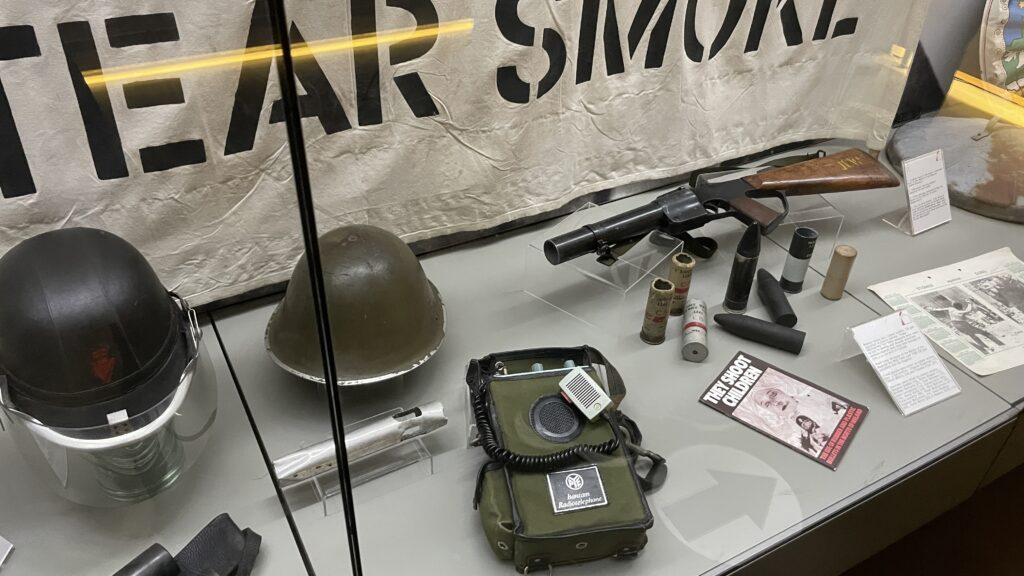 Military equipment used during the Troubles is displayed at the Museum of Free Derry. Rubber bullets and tear gas were commonly used alongside other weaponry.