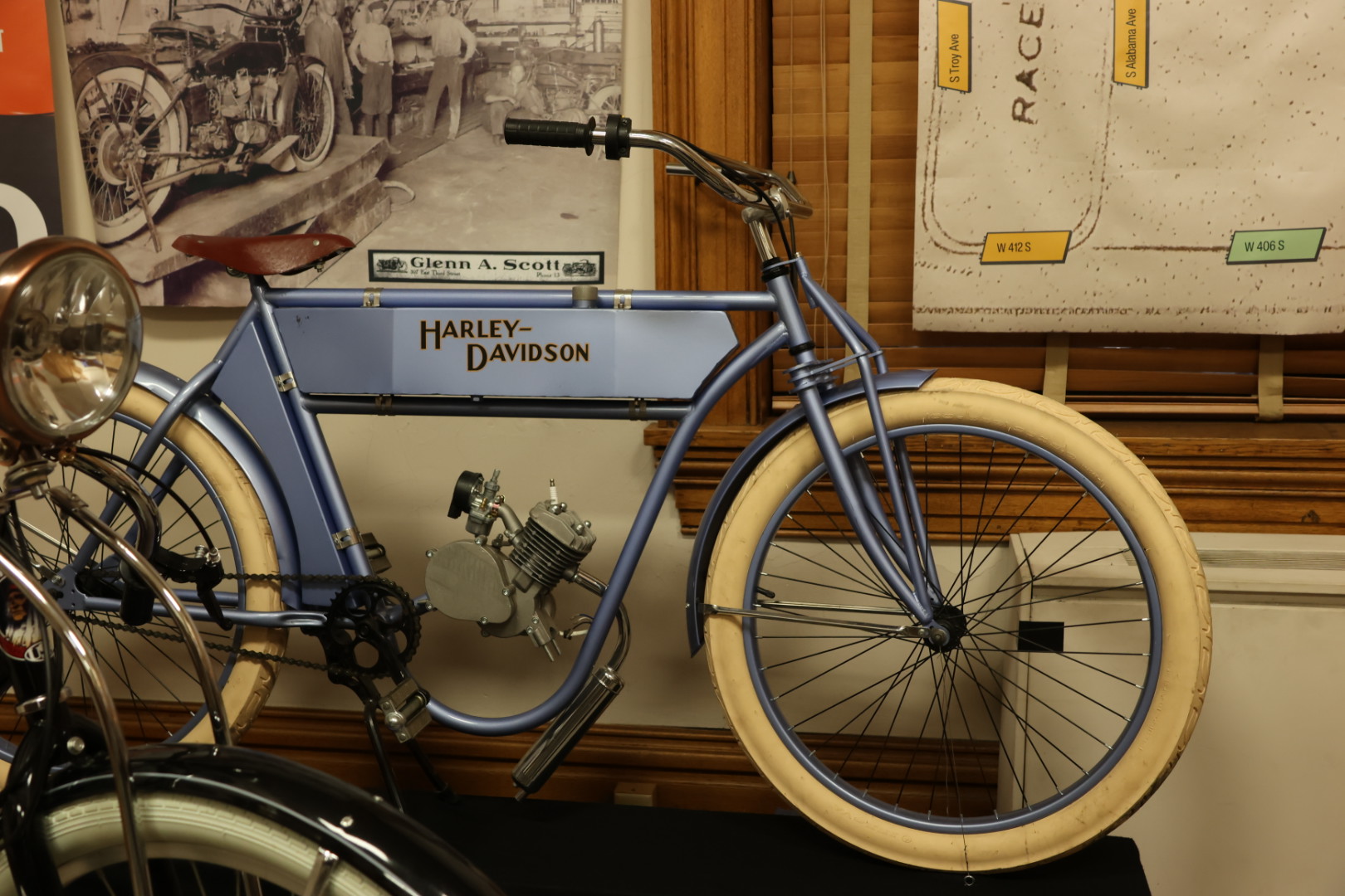 The exhibit shares the story of the Cornfield Classic race which was hosted in Marion in 1919 and 1920. It also looks at the Harley Davidson motorcycles of the time and how they came to be known as Hogs.