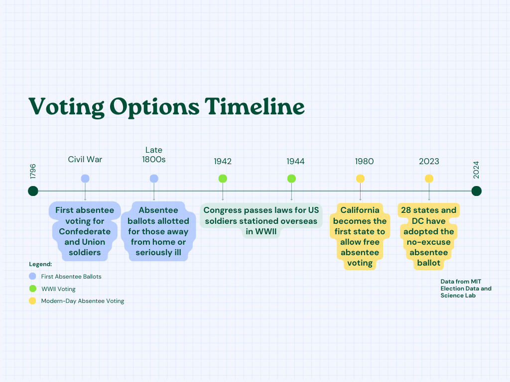 Absentee and early voting have spiked in popularity over the past few decades, especially since the COVID pandemic in 2020.