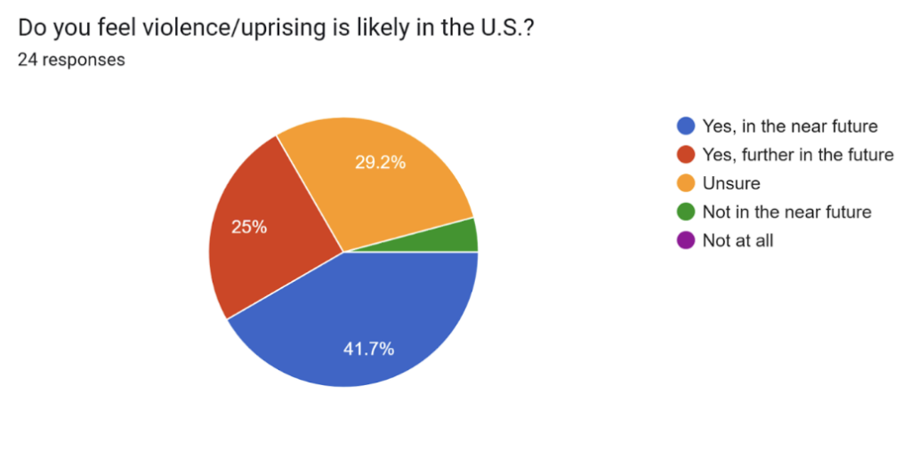 When asked in an independent study if violence or uprising was likely in response to growing tensions, 69.5% of Gen Z said violence is certain. Of those, 62.5% said that violence is coming sooner rather than later.