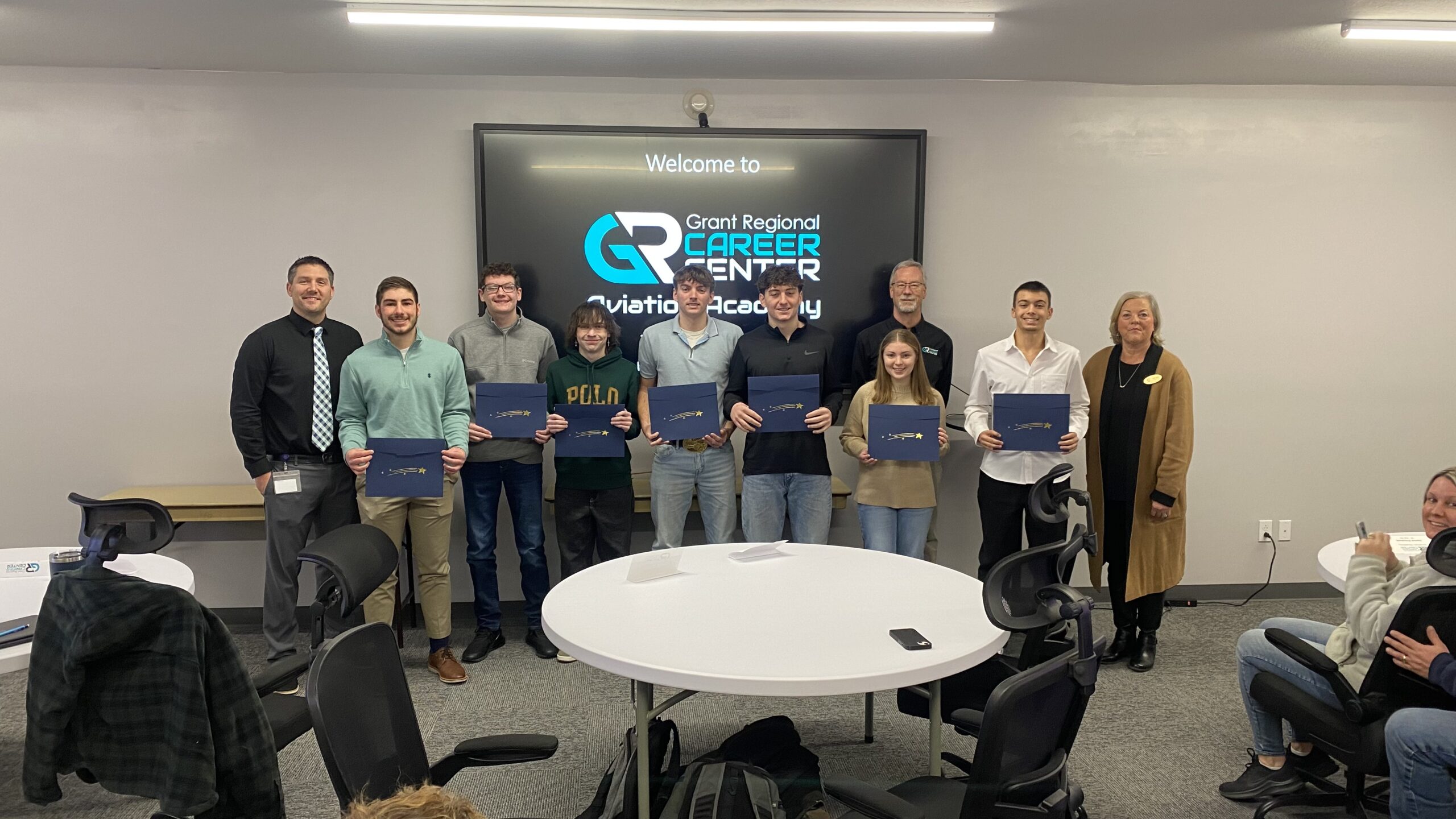 Seven high school students from across Grant County and Elwood Indiana received thousands of dollars in scholarship money at the Grant Regional Career Center Aviation Academy today.